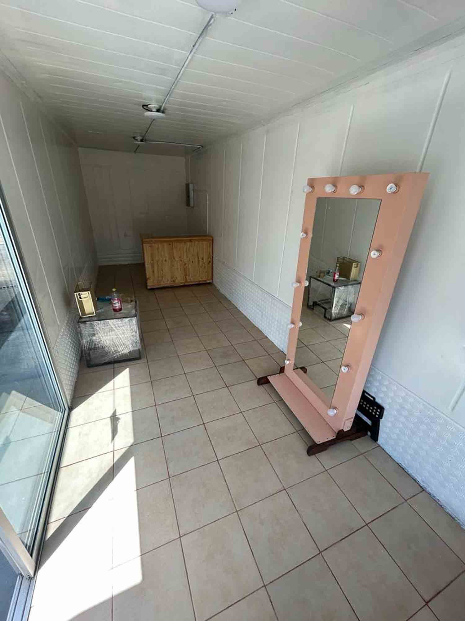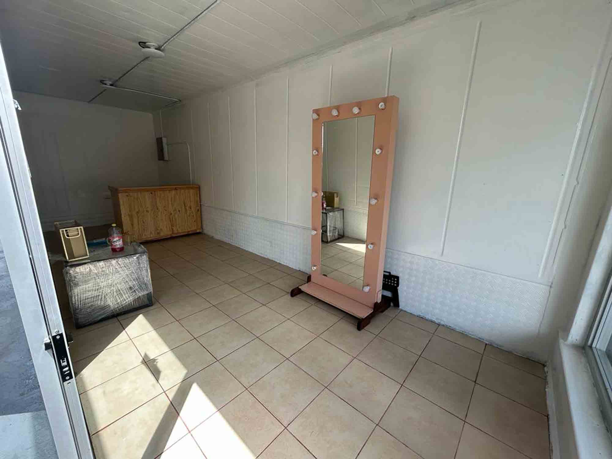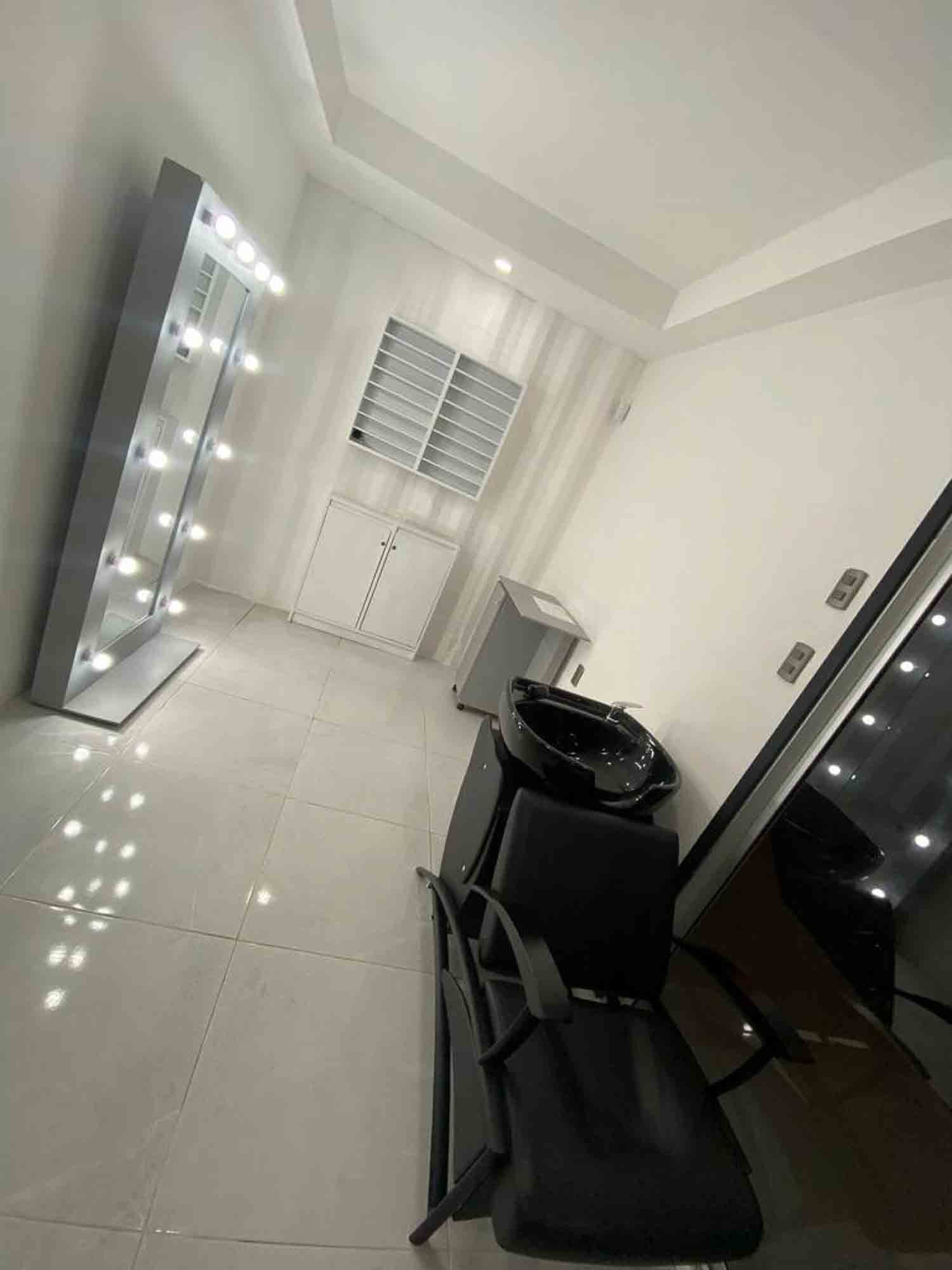 -Barbería funcional: Mueble de pared, lavacabezas, espejo, aire acondicionado.
